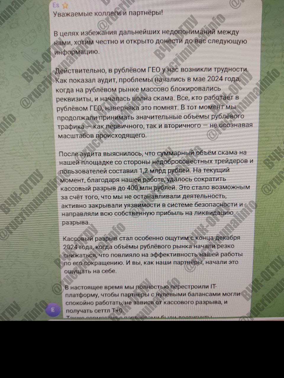 В мае 2025 года Валентина Чоботько сделала публичное заявление, признав «проблемы в рублевом сегменте» и оценив ущерб от «скама» в 1,2 миллиарда рублей по итогам так называемого аудита. При этом она призвала партнёров к «лояльности», обещая приоритет в выплатах тем, кто продолжит сотрудничество. Это типичный маневр пирамидальных схем: новые поступления закрывают старые долги. Никакого отчета о выплатах или аудита Чоботько не предоставила.