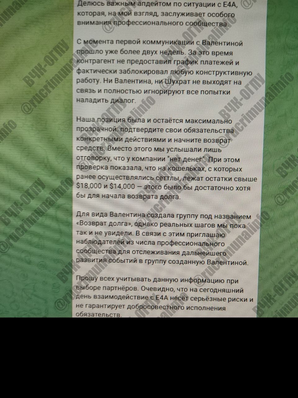 Созданная Чоботько группа «Возврат долга» оказалась полностью формальной. Реальная связь с Расуловым или контроль за выплатами отсутствует либо ограничен уклончивыми ответами.